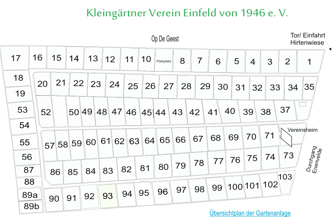 Die Gartenanlage des Kleingärtnervereins Einfeld von 1946 e.V. umfasst insgesamt 103 Parzellen und ist übersichtlich in Reihen gegliedert. Sie befindet sich zwischen der Straße „Op de Geest“ und dem Zugang „Enenvelde“, in unmittelbarer Nähe zur Hirtenwiese. Ein Hauptzugang mit Tor und Parkplatz befindet sich an der Straße „Op de Geest“, ein weiterer Durchgang ist über den Enenvelde erreichbar. Das Vereinsheim liegt zentral innerhalb der Anlage und dient als Treffpunkt für Veranstaltungen und Sprechzeiten.